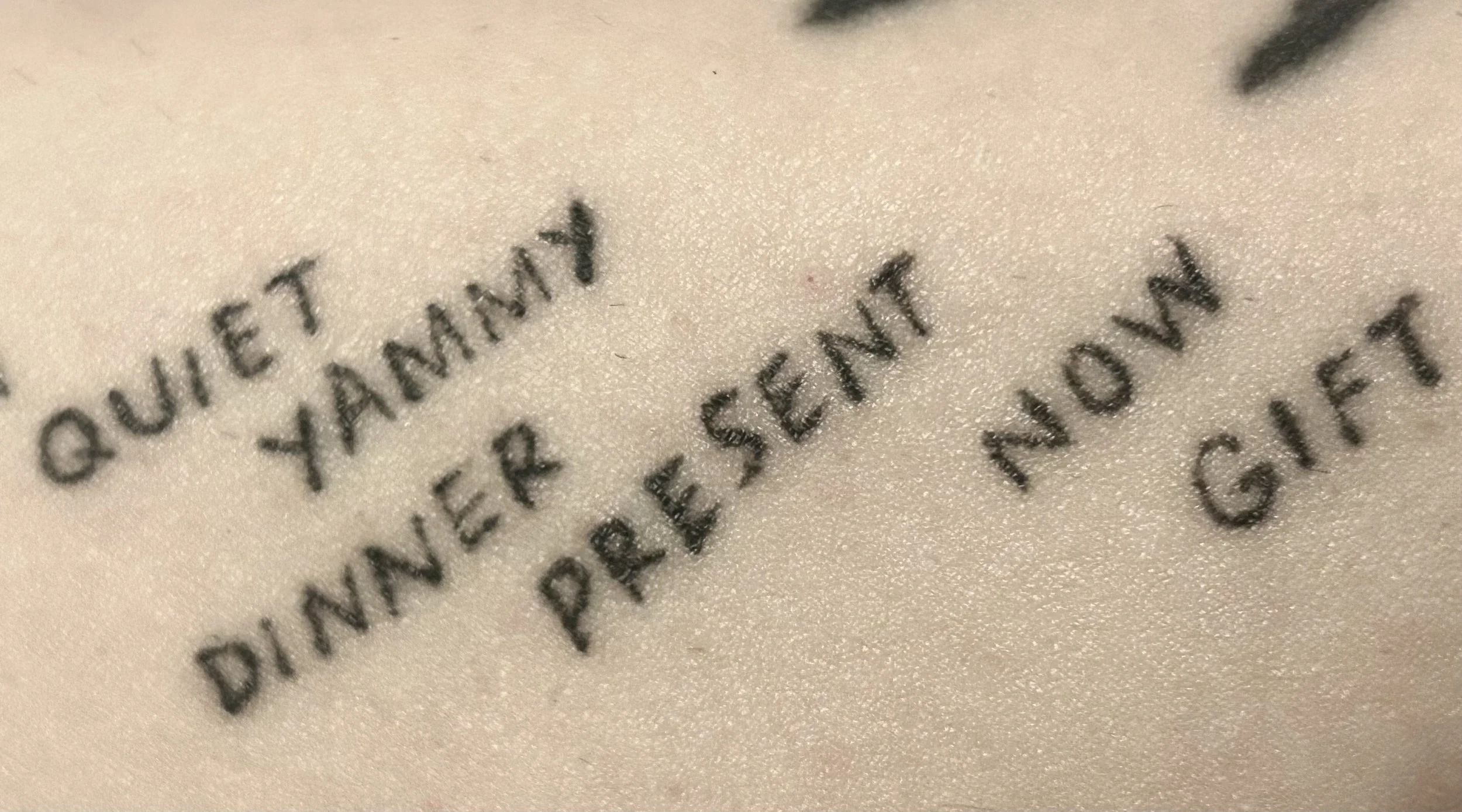 In this fifteen minute live desktop performance, the primary imagery was a short film composed of distorted found imagery wherein individuals revealed information on camera, displayed strong emotional reactions, and made confessions. I superimposed a live desktop window atop the short film to narrate my thoughts and actions in real time while the film played, describing my successes and failures in attempting to remember positive experiences throughout my life. Ultimately, the performance component focused on an interaction with the audience, who were asked to share a single word representative of a recent positive experience. Those words were then transcribed permanently onto my leg via live tattooing. This process was also projected onto the screen through a live-streamed camera which recorded my hands and legs.